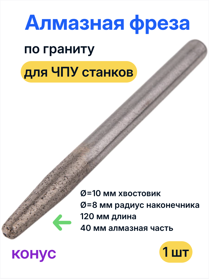 Алмазная фреза для гранита, конус R 8,0 мм с хвостовиком 10 мм (10×8×40×120) — это мощная коническая фреза для глубокой 3D‑резьбы и крупного рельефа по твёрдым породам камня.